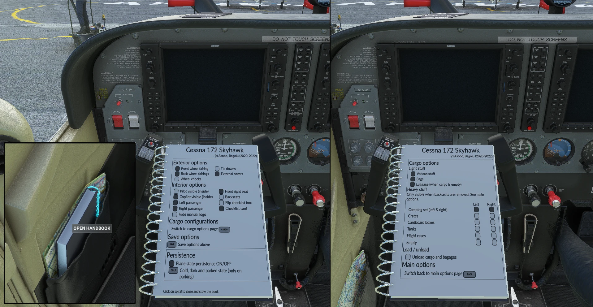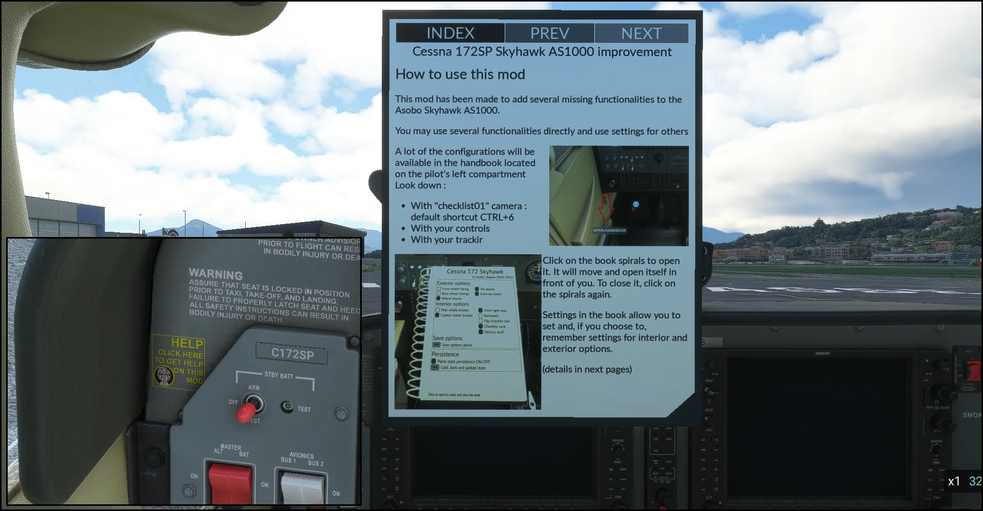 This is an improvement mod of one the default planes from MSFS made by Asobo, the Skyhawk with Garmin 1000 variant. It adds interior animations, new objects and passengers, various options inside and outside the plane.